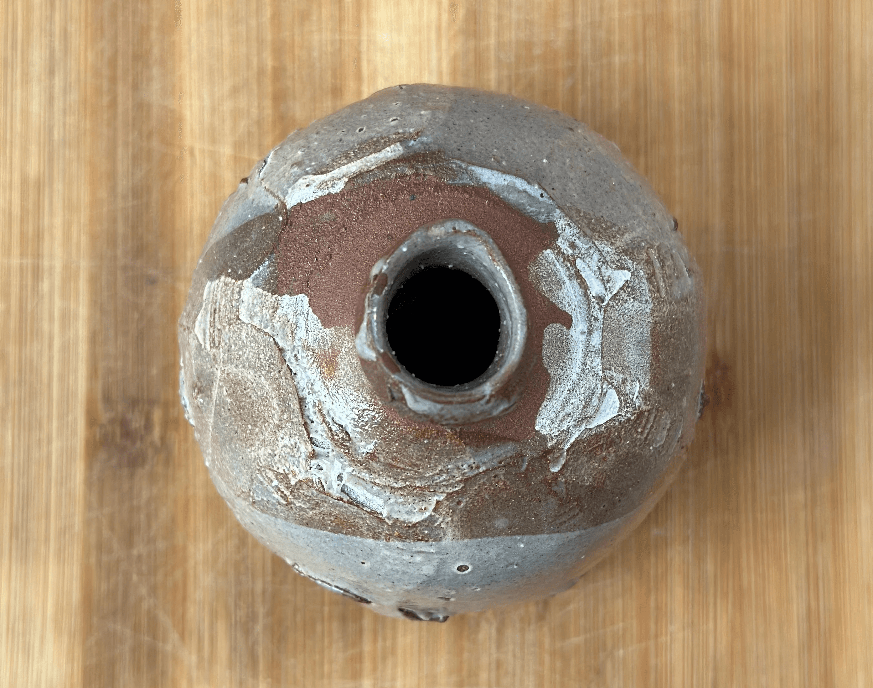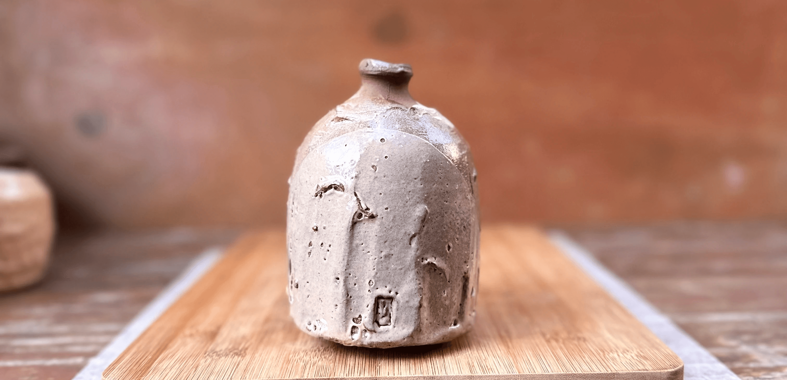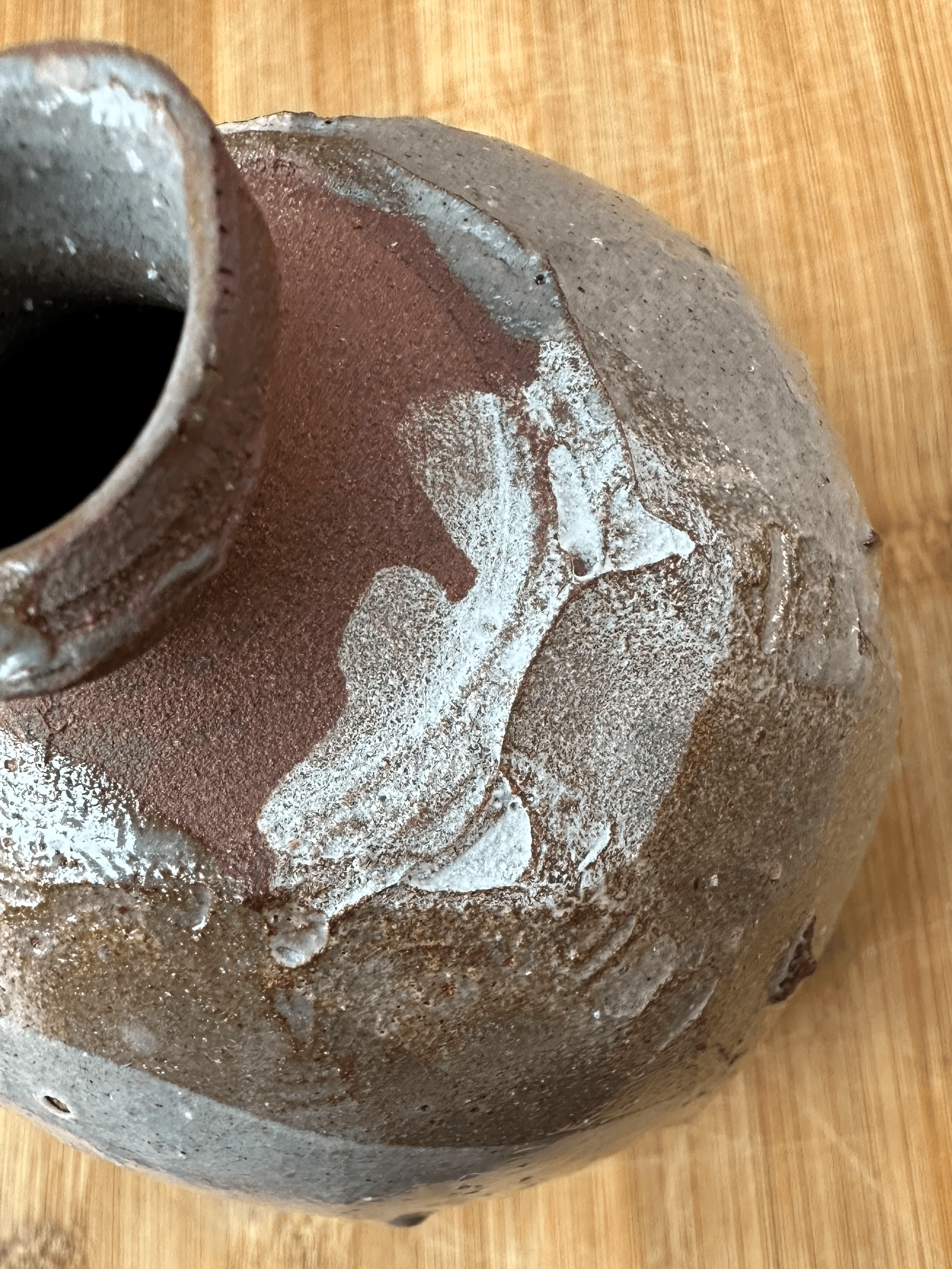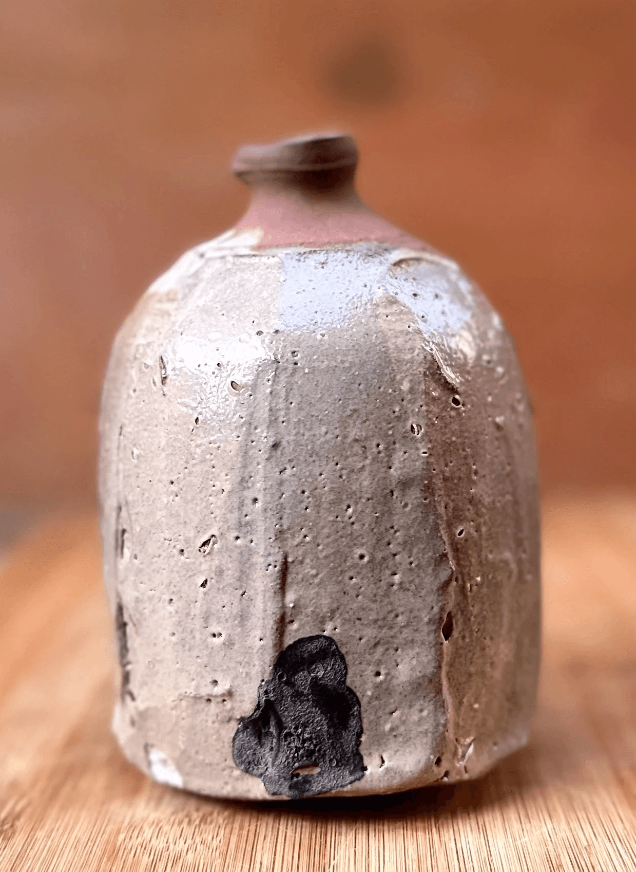 Garrafa da série pinta negra feita em torno e morteiro. Esmalte shino + carbonato de sódio em queima de alta cone 6.