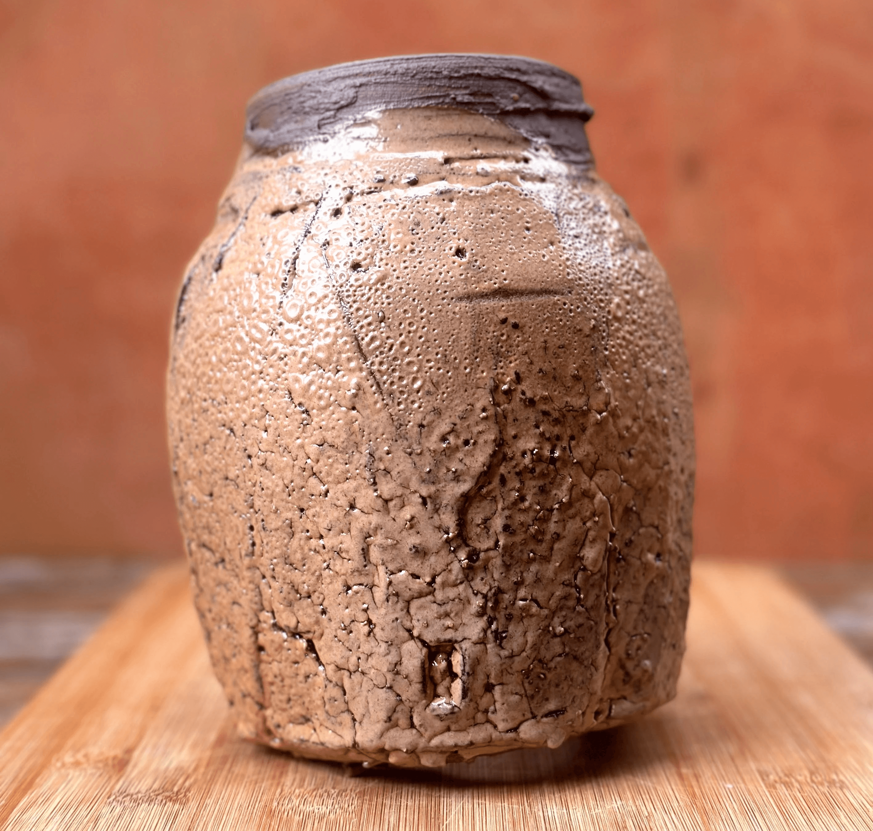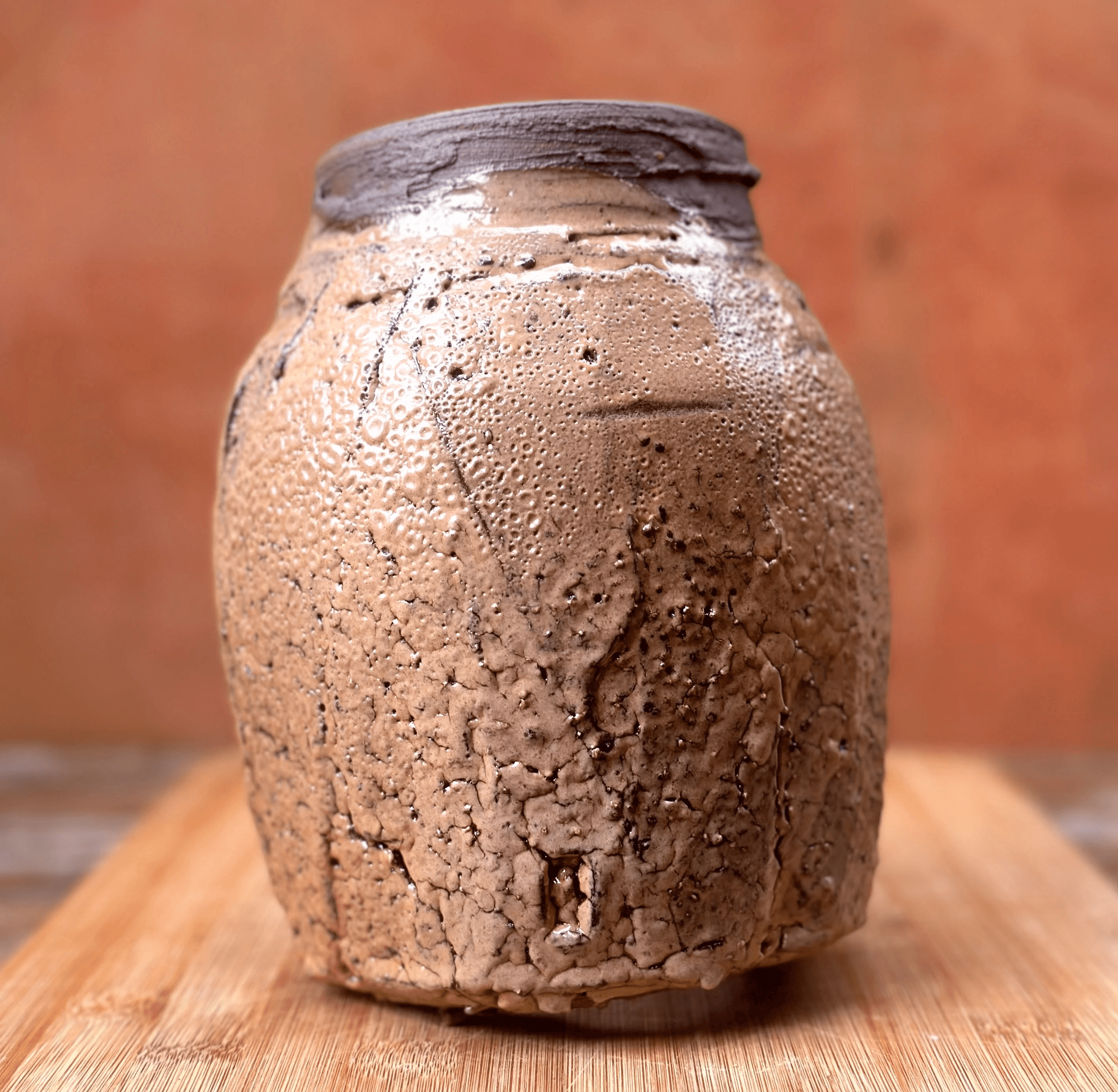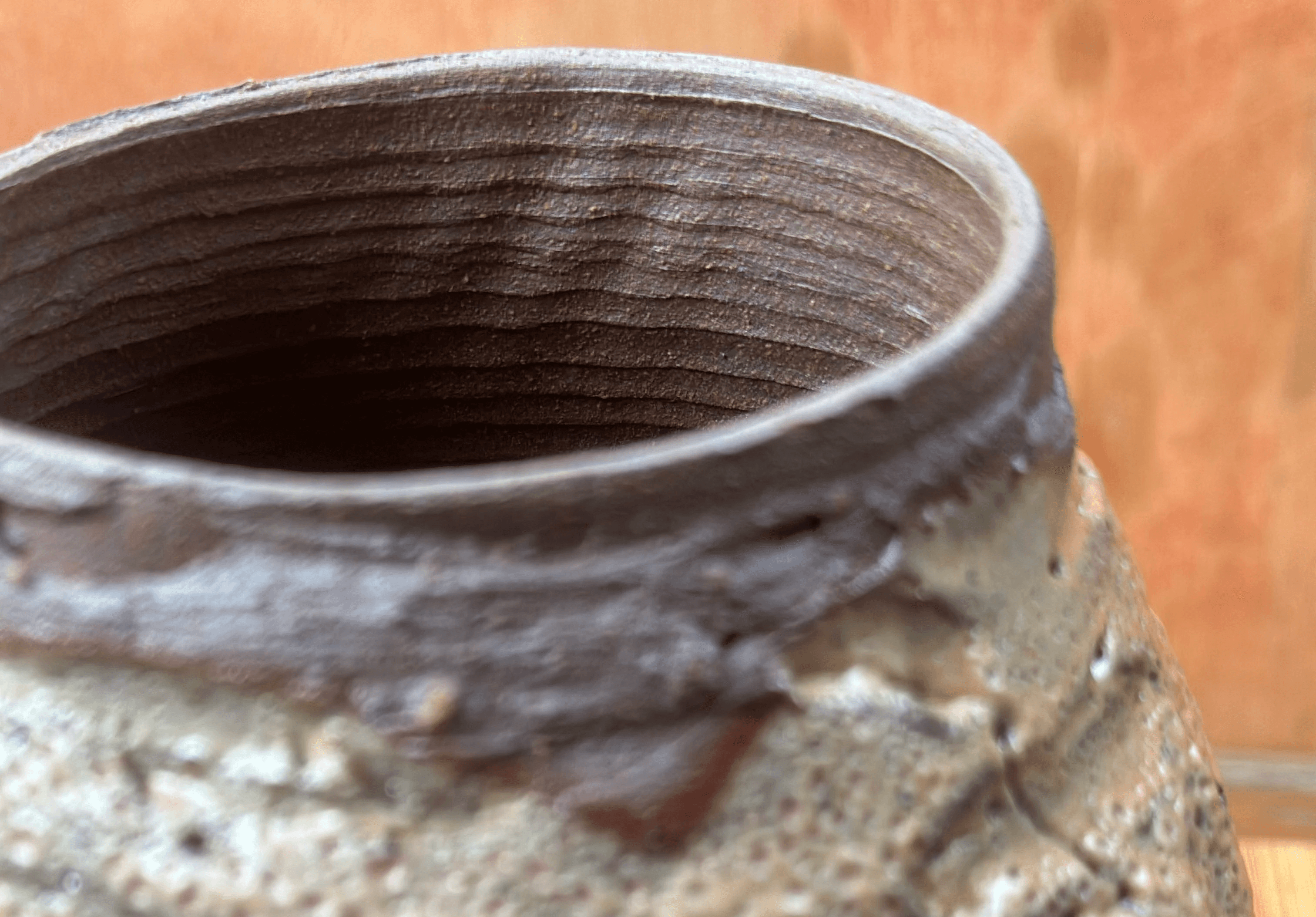 Vaso da linha Tsuchi em argila terracora, técnica de torno e morteiro, esmalte shino com queima de alta (cone 6).